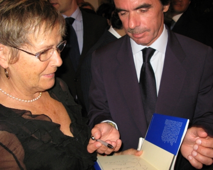 Este día quedará como uno de los mejores cumpleaños que yo haya celebrado. Tengo un marido que pasa de la política, es uno de tantos que todavía piensa que no puede cambiar nada. Pero, como era mi cumpleaños y quería complacerme, decidió asistir a la conferencia que dio el ex-presidente de España, Don José María Aznar. Yo tenía mucho interés en felicitar al Sr. Aznar por todo lo que ha hecho por el país que yo considero propio a pesar de los años que vivo fuera de él. Así se desarrollaron los hechos: Me acerqué a la primera fila de la sala en la que el Sr. Aznar se encontraba y dije: "Don José María Aznar". Él se levantó para atender mi petición con toda la humildad y fuerza que le caracteriza. "No quiero irme de aquí sin darle un beso por todo lo que usted ha hecho por España", le dije. "Dame dos, me respondió". No quise abusar y me fui a mi asiento en el que se encontraba mi marido. Pero quedé algo decepcionada. Había llevado su libro "Ocho años de Gobierno" con la esperanza de que me lo pudiera firmar. Al finalizar la charla procedí a acercarme a él de nuevo. Había muchos que sin duda sentían como yo. Supe ser paciente y esperar. Al final conseguí acercarme a él y obtuve su atención. Le dije: "Va a pensar usted que soy una pesada por encontrarme de nuevo junto a usted". Me dijo que de ninguna manera. "Es que hay más", le dije. "Me gustaría que me firmara usted su libro". No dudó en hacerlo.  José María Aznar y Carmen Edler